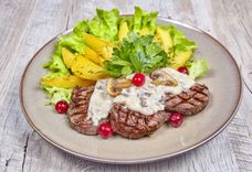 235 г • Зяленый салат, ялавічына, цукіні, грыбы, сырны соус