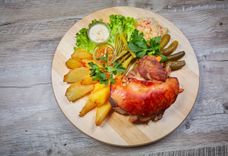 Рулька свіная, запечаная ў мядовым марынадзе, гарніраваная бульбянымі дзелькамі ды саленнямі