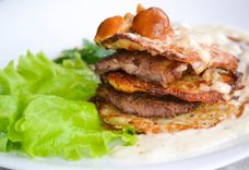 Дранікі з медальёнамі са свініны пад грыбным соусам