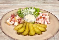 250/90 г • Сало, грудзінка вэджаная, язык, каўбаса, свініна, хрэн, цыбуля, агурок