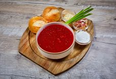 Боршч з пышкамі, падаецца з салам, часноком і смятанай